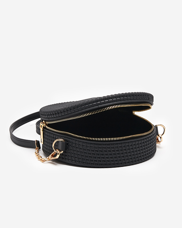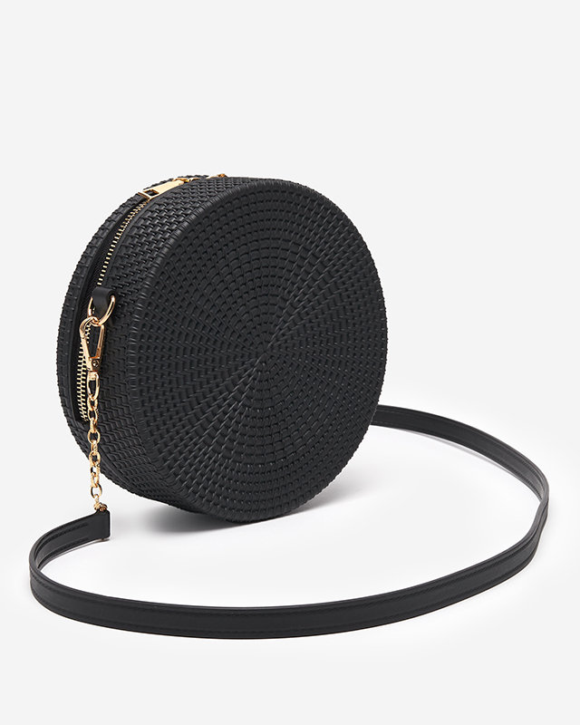 - Унікальна жіноча кругла сумочка з гумового матеріалу з тисненням. Модель на блискавці, всередині одне відділення без додаткових кишень. Поставляється з довгим ремінцем, прикріпленим до застібки-гачка без можливості регулювання.