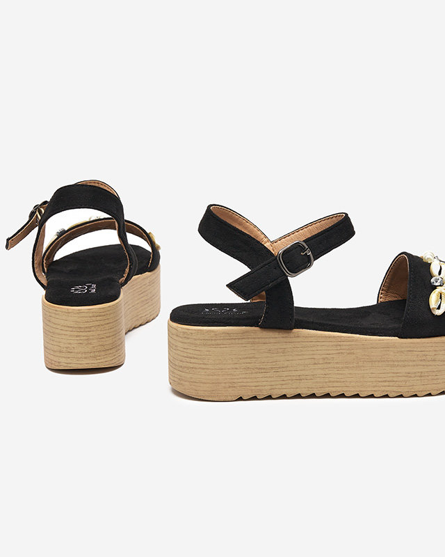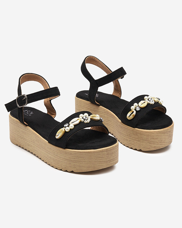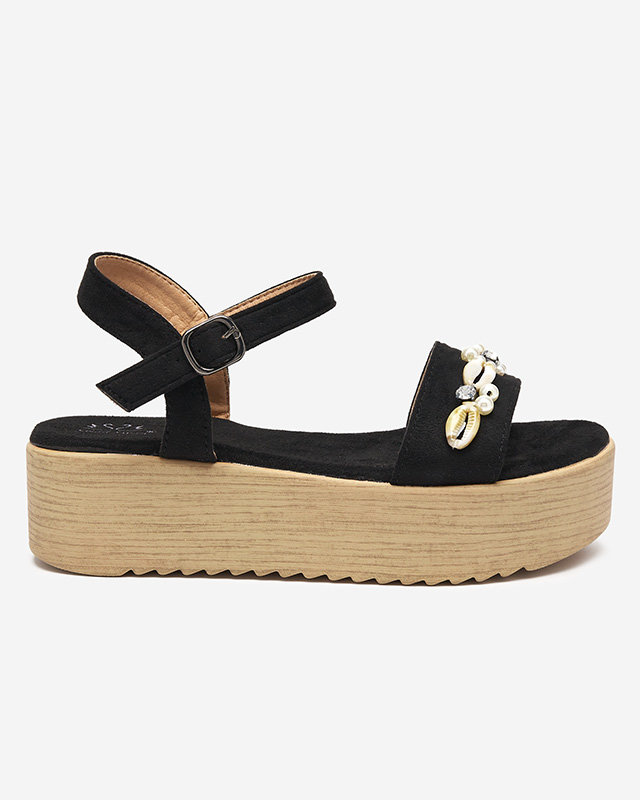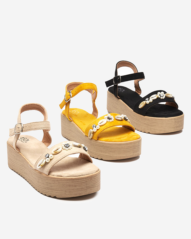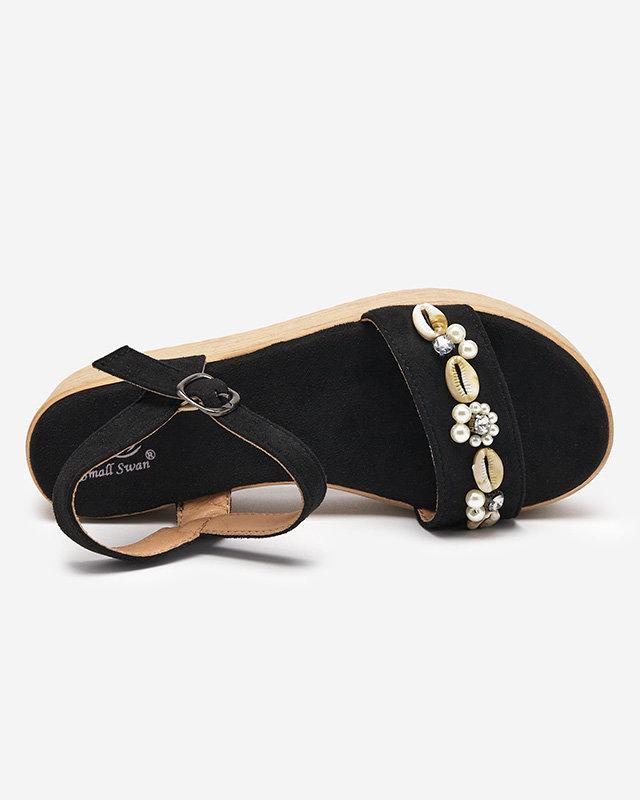 - Красиві жіночі босоніжки. Виготовлені з екологічної замші. Модель застібається на пряжку навколо щиколотки, устілка виконана з еко-замші. Пара прикрашена черепашками, перлами та кристалами. Ідеально завершить літній образ.