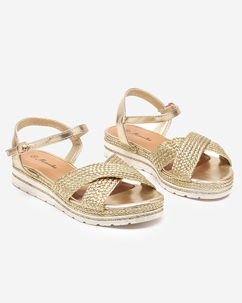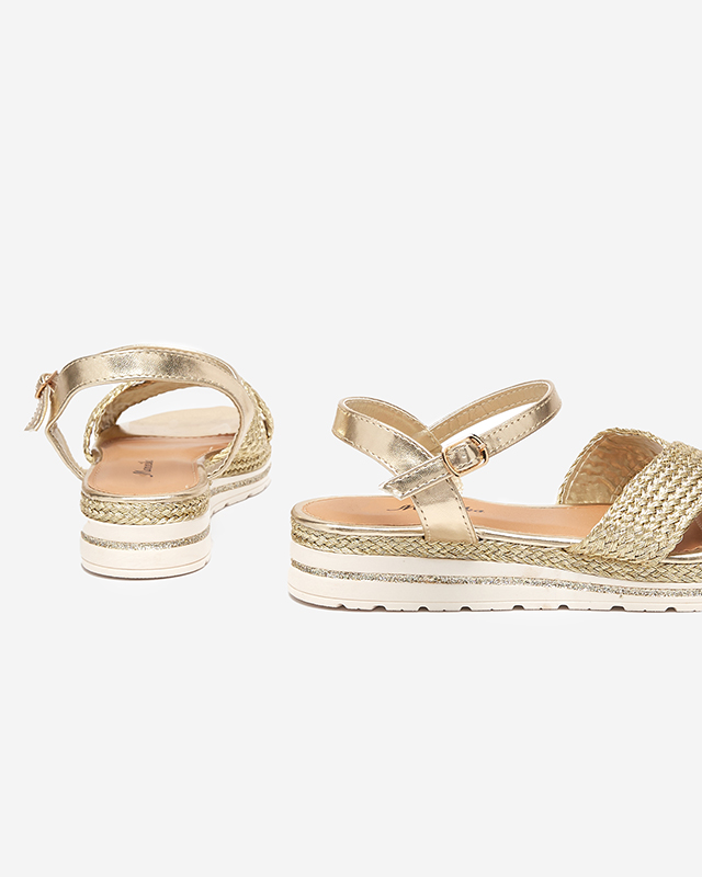 - Унікальні жіночі босоніжки на низькій танкетці, прикрашені блискітками. Ремінець виготовлений з плетеного матеріалу, устілка з екологічної шкіри.