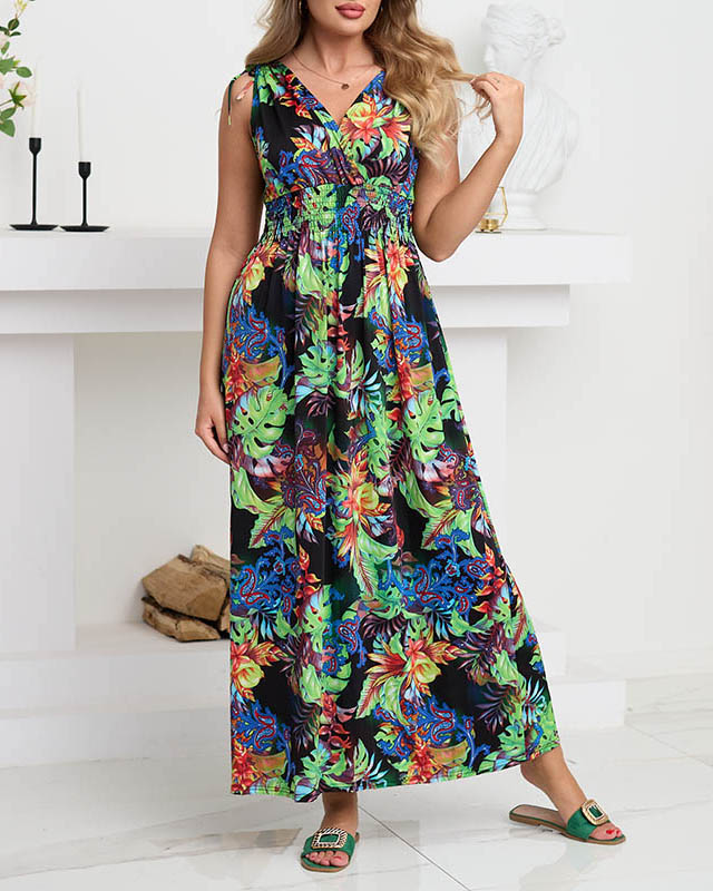 - Жіноча максі сукня з малюнком з м'якої ковзкої тканини з квітковим мотивом. Модель на широких бретелях, має виріз-конверт, стягуючу гумку, що підкреслює талію. ПРИМІТКА: Точність вимірювання (+/-) 1 см.