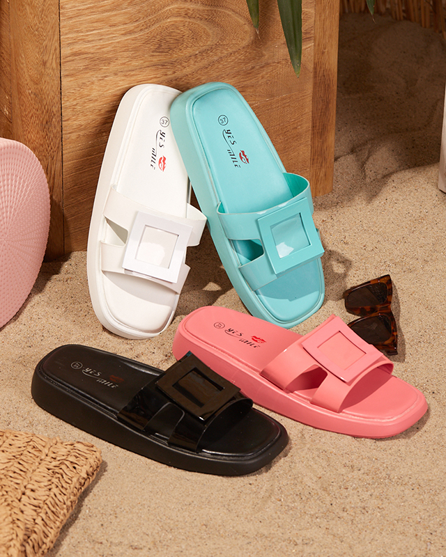 - Стильні жіночі тапочки з поєднання еко-лакованої шкіри та мату. Верх має металевий декор відповідного кольору. Класне взуття на літо!