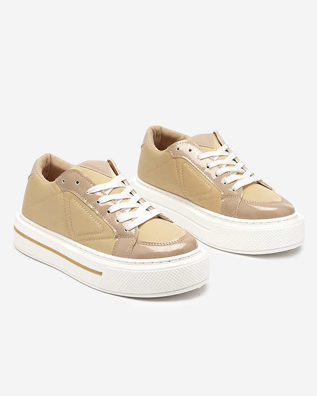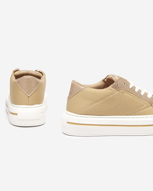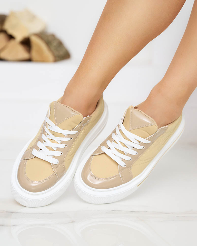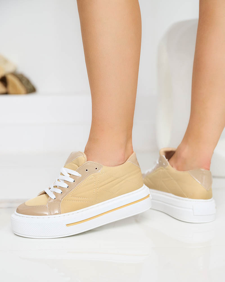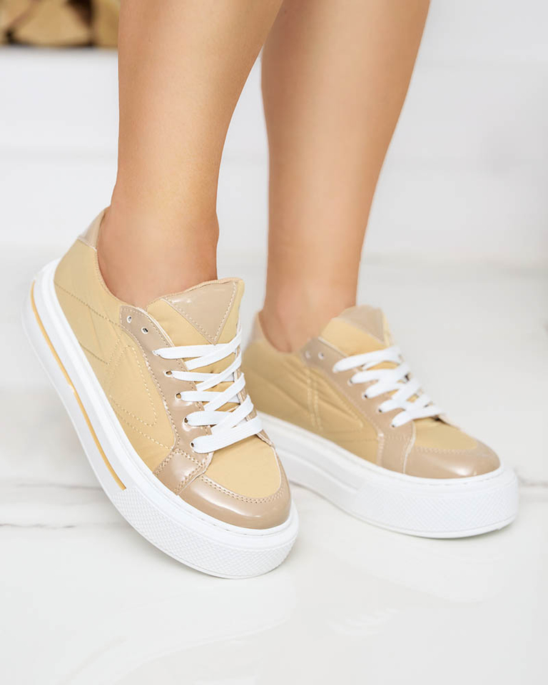 - Жіноче спортивне взуття на шнурівці. Модель виконана з комбінації тканини та лакованої еко-шкіри. Підошва з товстої гуми, устілка з тканини.