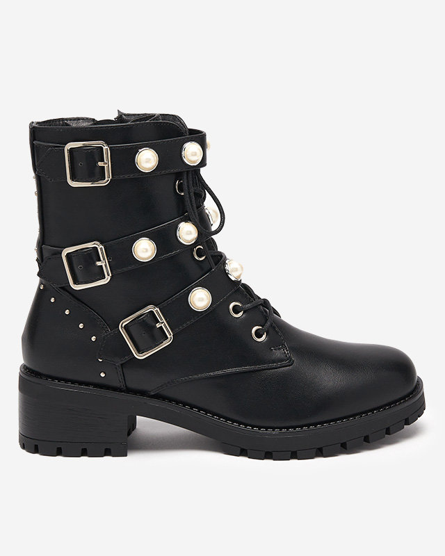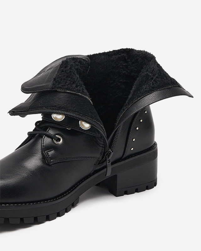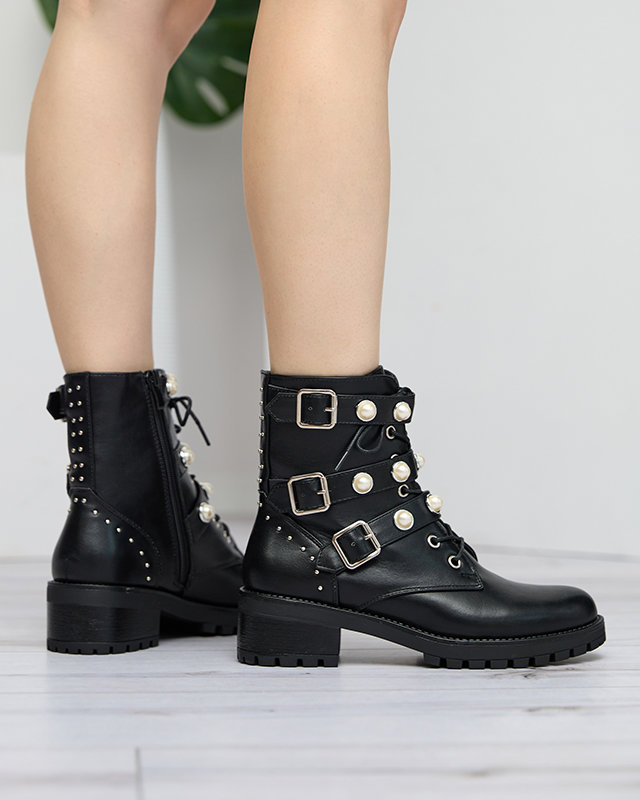 - Жіночі чоботи на плоскому каблуці з еко-шкіри, всередині утеплені штучним хутром. Верх декорований перлами та заклепками, модель на шнурівці та на блискавці.