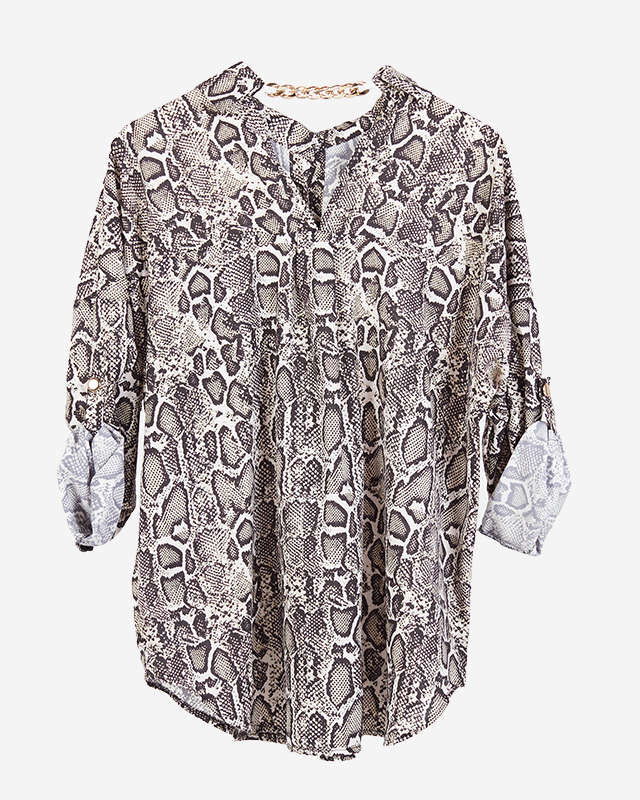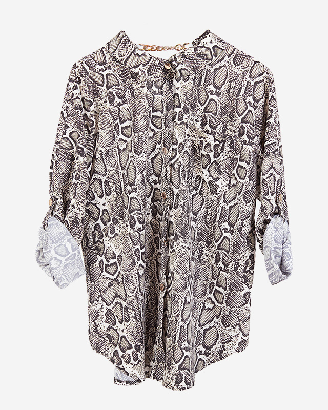 - Жіноча сорочка з малюнком великого розміру з декоративним ланцюжком на спині. Модель має: - довгі рукави з можливістю застібки, - застібку на гудзики, - 1 кишеню, - оригінальний і дуже модний малюнок. ПРИМІТКА: Точність вимірювання (+/-) 1 см.