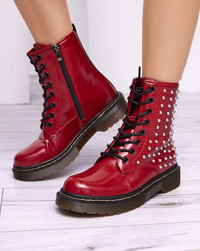 - Унікальні стильні жіночі чоботи на плоскому каблуці, прикрашені шипами. Пара виготовлена з лакованої екологічної шкіри, всередині обшита ніжним хутром. Черевики зашнуровуються і застібаються на блискавку з боків. ЧЕРВОНЕ УТЕПЛЕНЕ ВЗУТТЯ DERISA