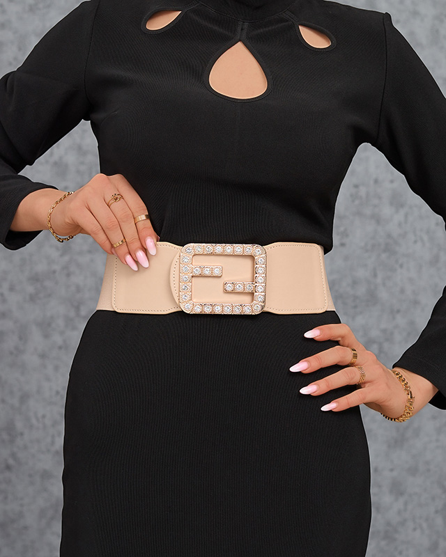 - Суперстильний жіночий ремінь з великою металевою пряжкою оздобленою золотими цирконами. Виріб виготовлено з поєднання екологічної шкіри та гуми. Чудове доповнення до ваших повсякденних образів!