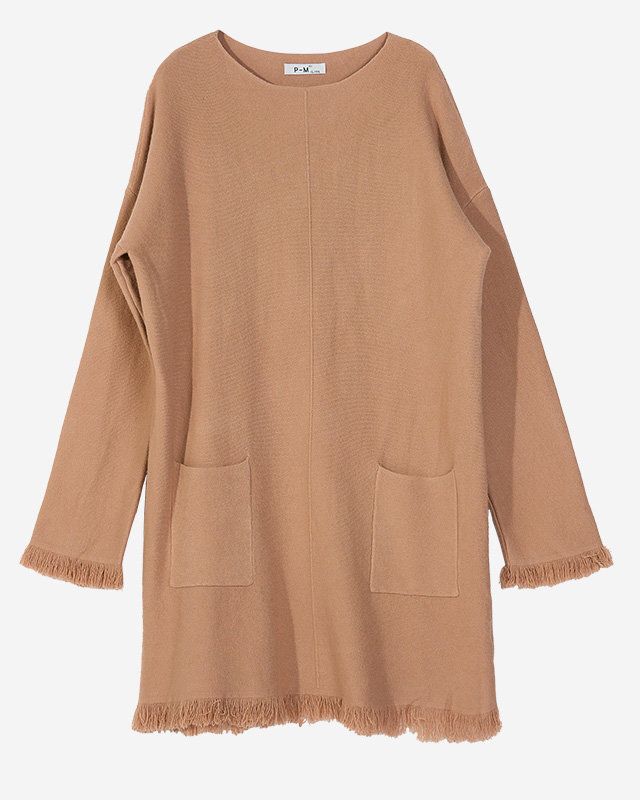 - Унікальний жіночий светр-туніка з довгими рукавами, оброблений бахромою. Дуже м'яка тканина - приємна на дотик. Модель має круглий виріз і дві кишені з боків. ПРИМІТКА: Точність вимірювання (+/-) 1 см.