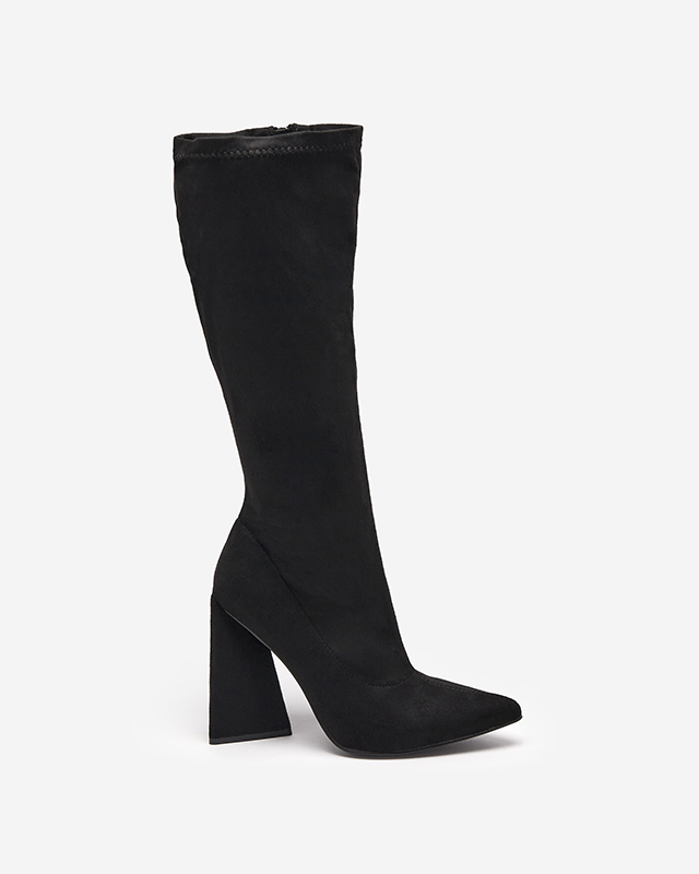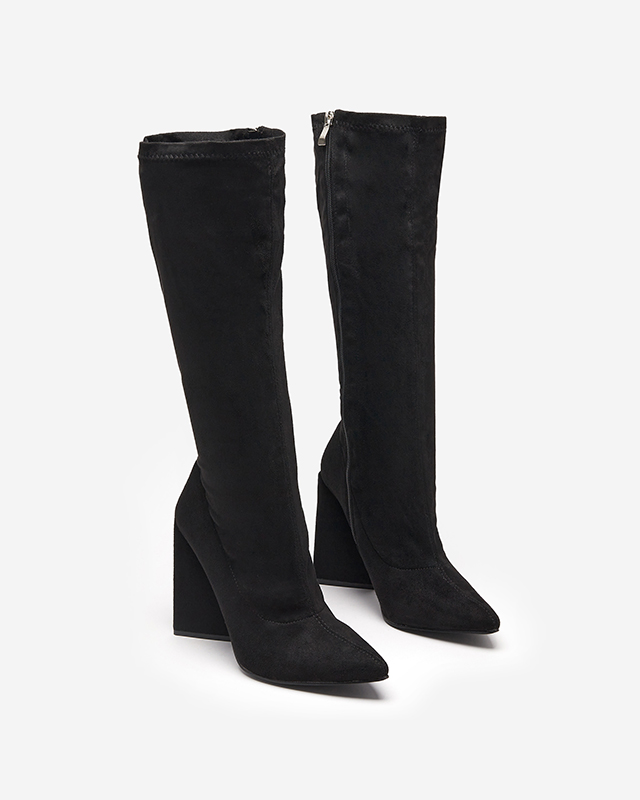 - Вишукані чобітки на каблуці з гострим носком. Верх виконаний з еко-замші чорного кольору. Устілка покрита екошкірою. Взуття застібається з внутрішньої сторони.