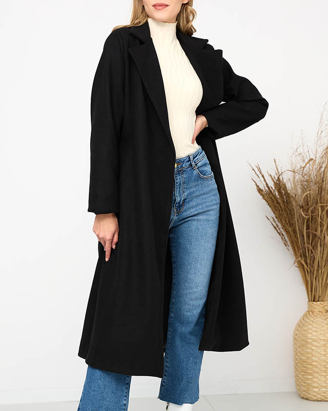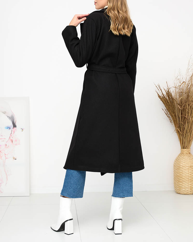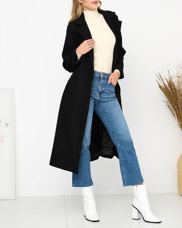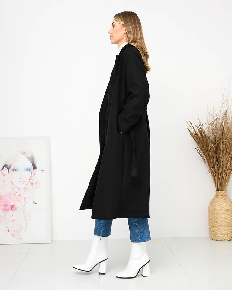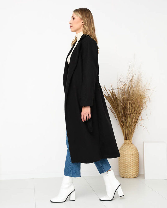Чорне довге жіноче пальто з поясом - Одяг