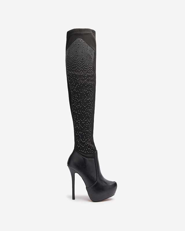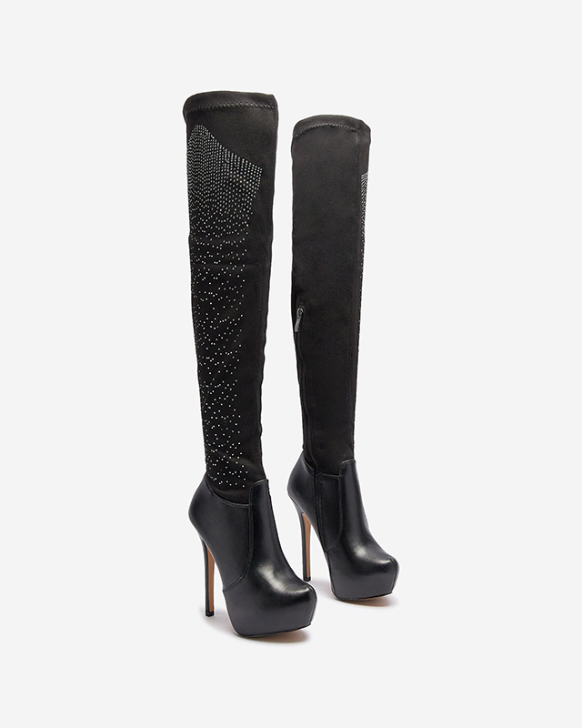 - Елегантні чоботи на шпильці та платформі з екошкіри та екозамші. Устілка - хутро. Модель вище коліна, з круглим носом, застібається на блискавку до середини ікри. Верх декорований цирконами. ЧОРНІ ЖІНОЧІ ЧОБОТИ БОТФОРТИ AGIOCIO