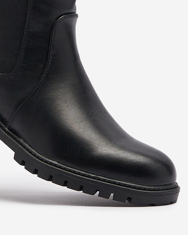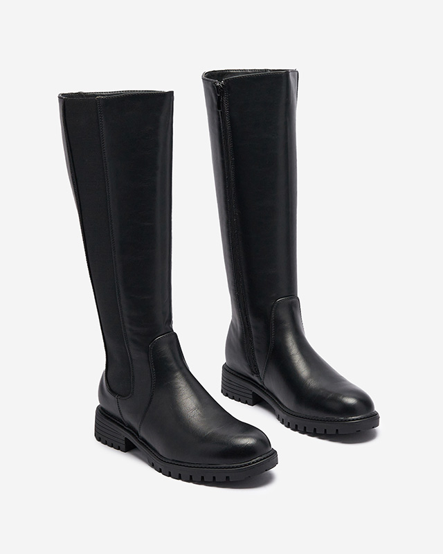 - Класичні жіночі чоботи до коліна на плоскому каблуці. Верх на блискавці, виготовлені з еко шкіри, з боків еластичні вставки. Внутрішня частина підбита тканинним матеріалом. ЧОРНІ НЕУТЕПЛЕНІ ЧЕРЕВИКИ DEXIS ЧЕРЕВИКИ