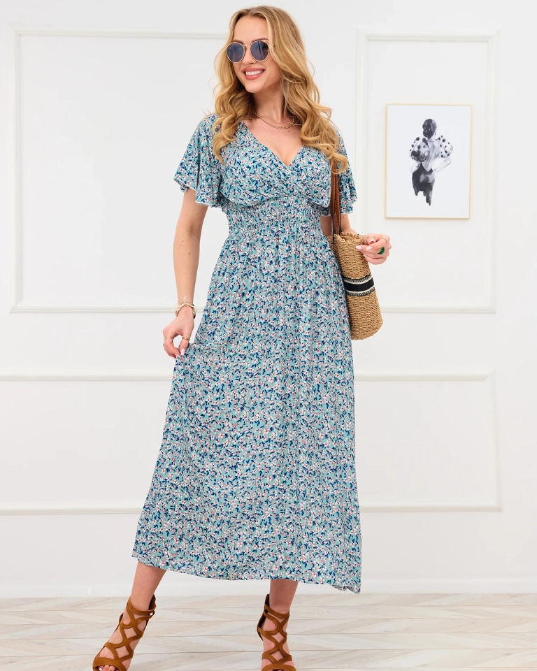 Зелена жіноча квітчаста сукня з вирізом-конвертом - Одяг