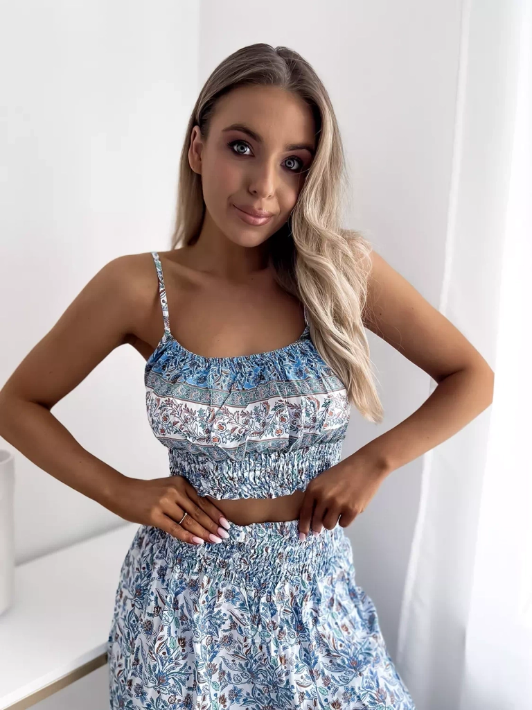 • Унікальний жіночий комплект, виготовлений з приємної бавовняної тканини. Короткий топ має регульовані бретелі та еластичний пояс. Штани з тканини також мають широку резинку на талії та на кінцях штанин. ПРИМІТКА: Похибка вимірювання (+/-) 1 см.