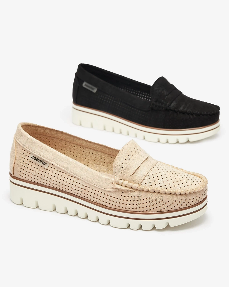 • Зручні жіночі мокасини з блискучим покриттям. Ажурний верх з натуральної замші, устілка з натуральної шкіри. Чудове доповнення до повсякденного вбрання!