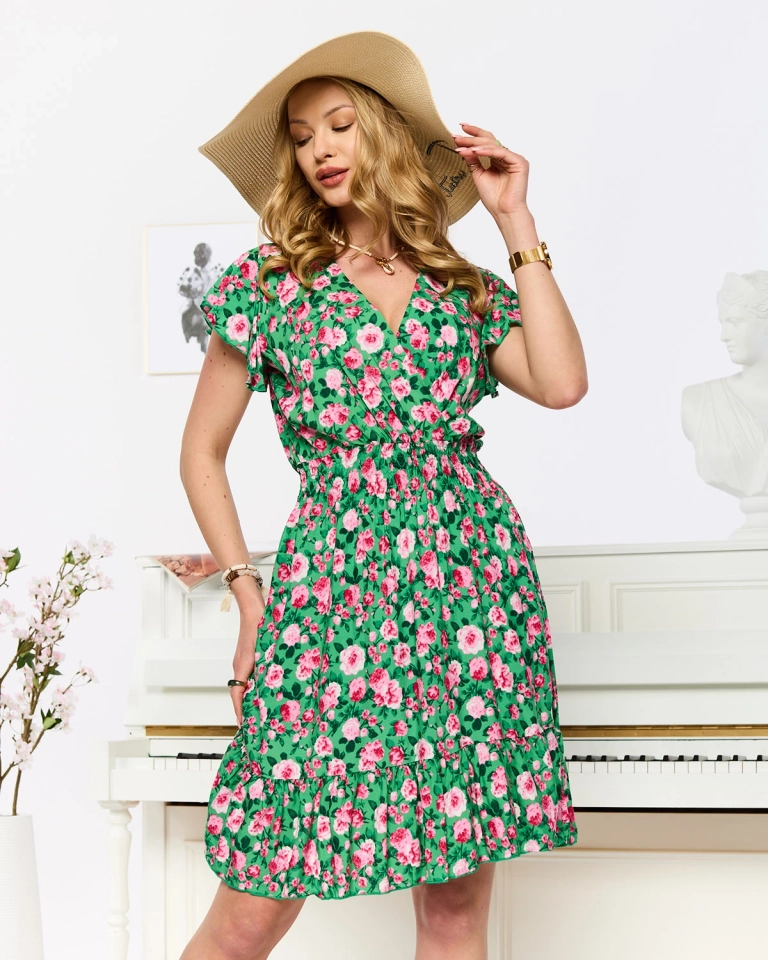 • Жіноча коротка сукня з легкої тканини з квітковим принтом. Модель з вирізом горловини конвертом і коротким рукавом. На поясі - еластична резинка, що підкреслює талію. Ідеальна з босоніжками! ПРИМІТКА: Похибка вимірювання (+/-) 1 см.