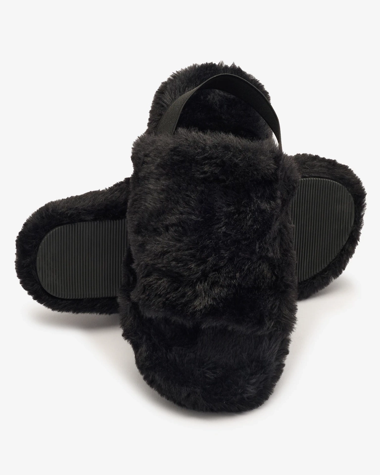 - Красиві жіночі капці на потовщеній підошві, виготовлені з матеріалу зі штучного хутра. Модель має гумовий ремінець ззаду, завдяки чому ви зможете легко відрегулювати їх по нозі. УВАГА: взуття рекомендоване для людей з вузькою анатомією стопи.