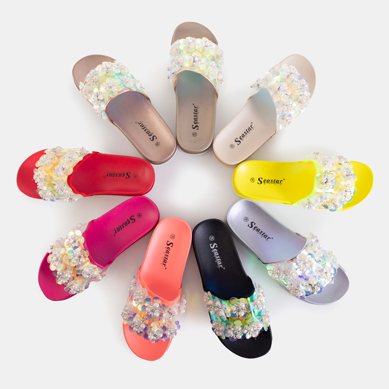 • Гумові шльопанці з квітами та перлинами - ідеальне поєднання комфорту та стилю. Верх виконаний з пластику з голографічним покриттям, устілка та підошва - з каучукового матеріалу. Вони ідеально підійдуть як для пляжу, так і для прогулянки містом.