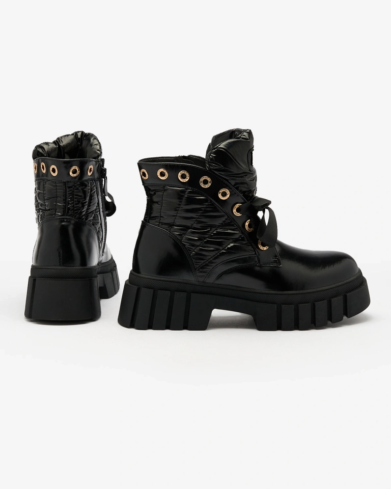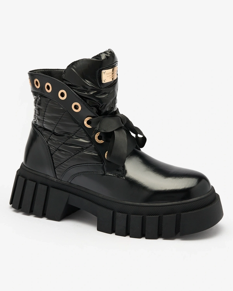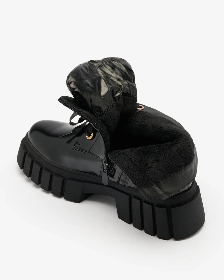 • Стильні жіночі чоботи на потовщеній підошві, стьобаний верх з комбінації екошкіри та матеріалу а-ля клейонка. Устілка наповнена м'яким хутром. Модель на шнурівці та блискавці. ЧОРНІ ЖІНОЧІ УТЕПЛЕНІ ЧЕРЕВИКИ ALEFRO