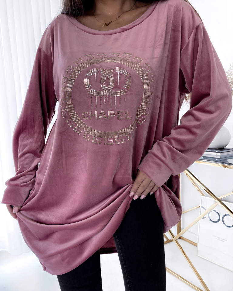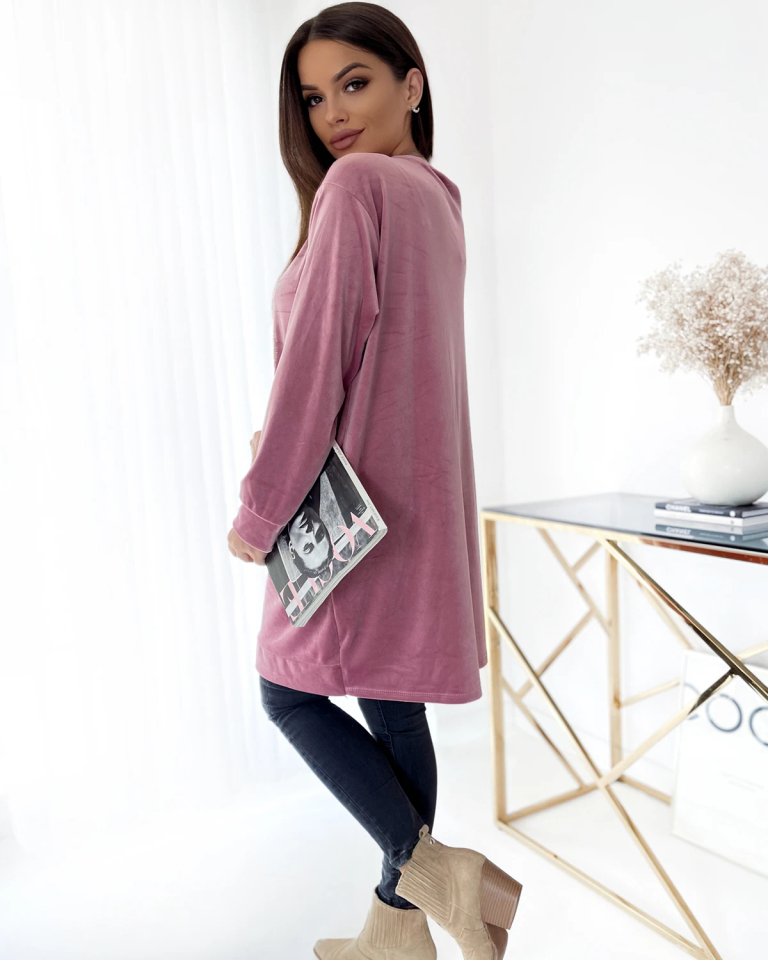 - Стильна жіноча довга туніка, виконана з м'якої тканини а-ля велюр. Виріб декорований нашивкою з цирконію, має довгий рукав та дві врізні кишені. Must have в гардеробі кожної жінки! ПРИМІТКА: Похибка вимірювання (+/-) 1 см.