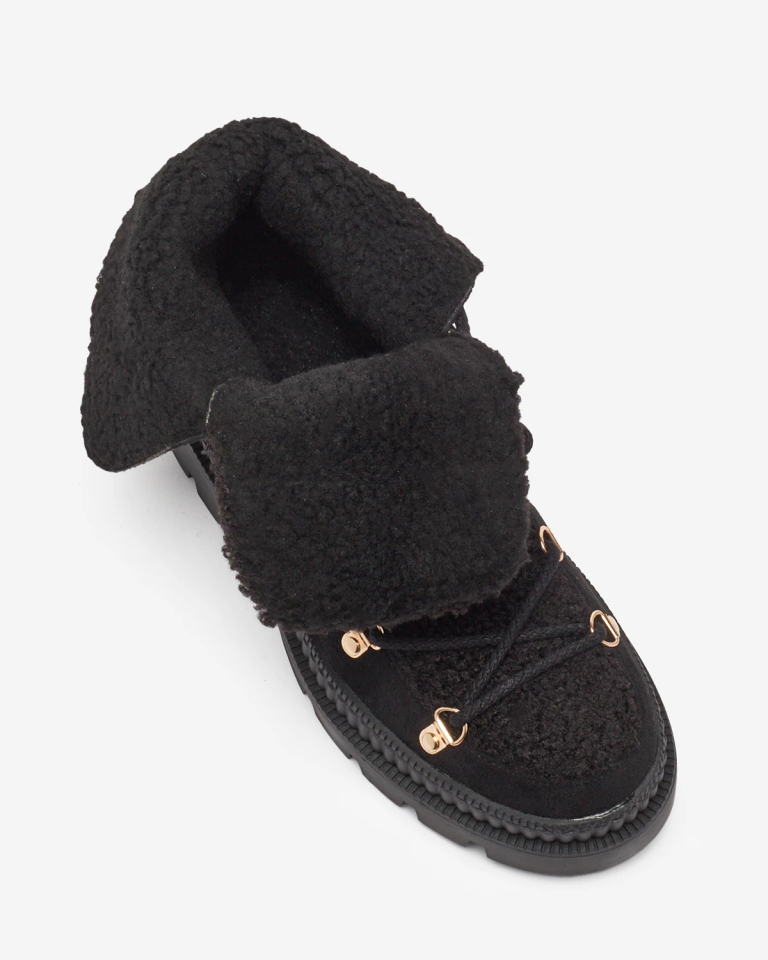 • Стильні жіночі черевики-трапери на шнурівці ідеально підходять для холодних днів. Верх виконаний з комбінації еко-замші та м'якої овчини. Внутрішня частина також утеплена овчиною, що робить їх не тільки модними, але й теплими