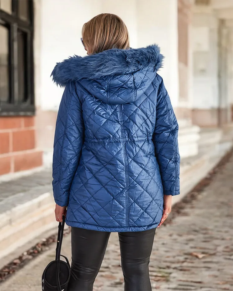 • Жіноча стьобана куртка до коліна. Модель має капюшон на хутрі та дві кишені. Застібається куртка на блискавку. Модель утеплена хутром знизу і має пояс на шнурку. Чудово підійде для осінньої погоди.