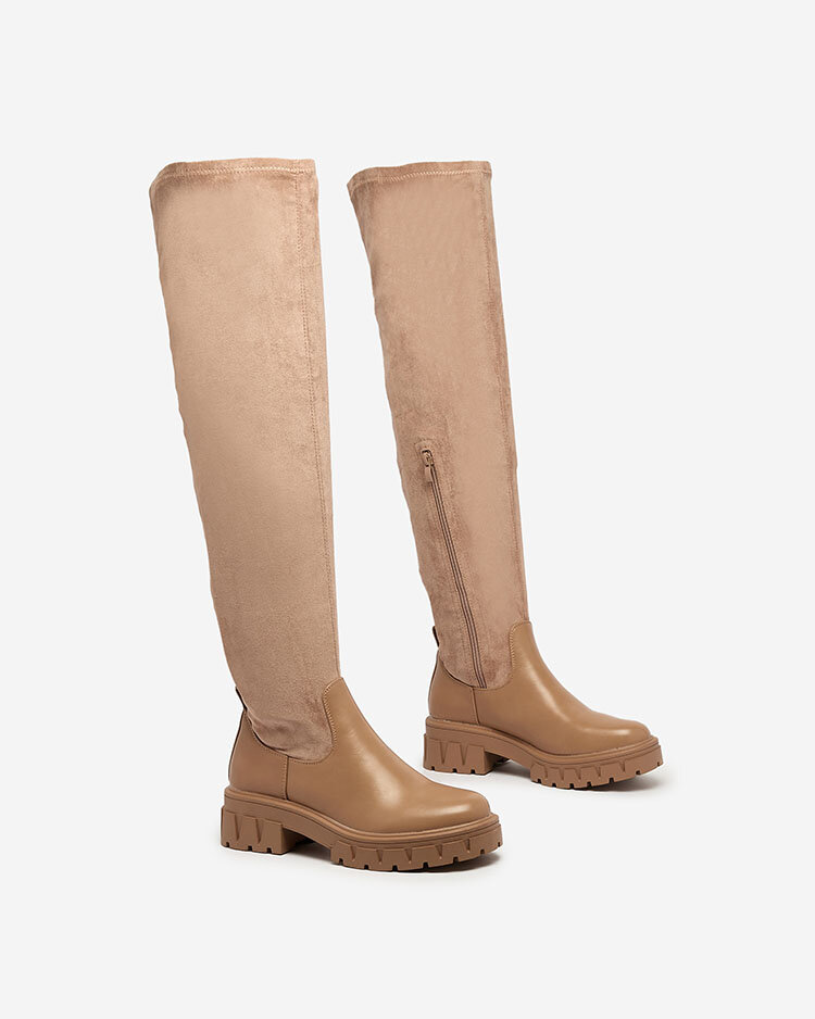 - Стильні жіночі чоботи вище коліна на потовщеній підошві. Верх виконаний з еко-замші та зі вставками з еко-шкіри. Устілка з тканини. Модель сліпони.