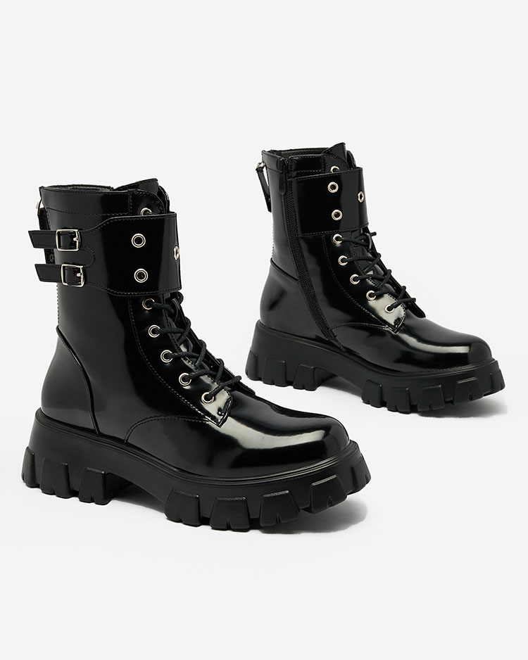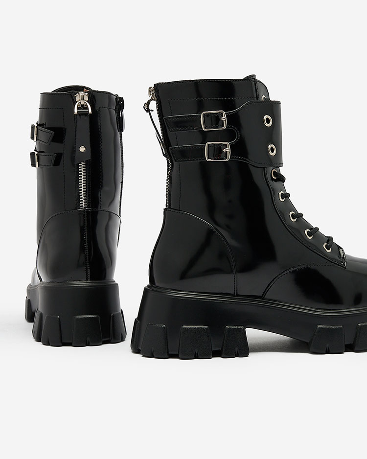• Жіночі черевики-баггі - унікальне взуття, що поєднує стиль і комфорт. Виготовлені з лакованої екологічної шкіри, всередині утеплені м'яким хутром. Застібаються на шнурівку та блискавку. Потовщена підошва додає взуття комфорту.