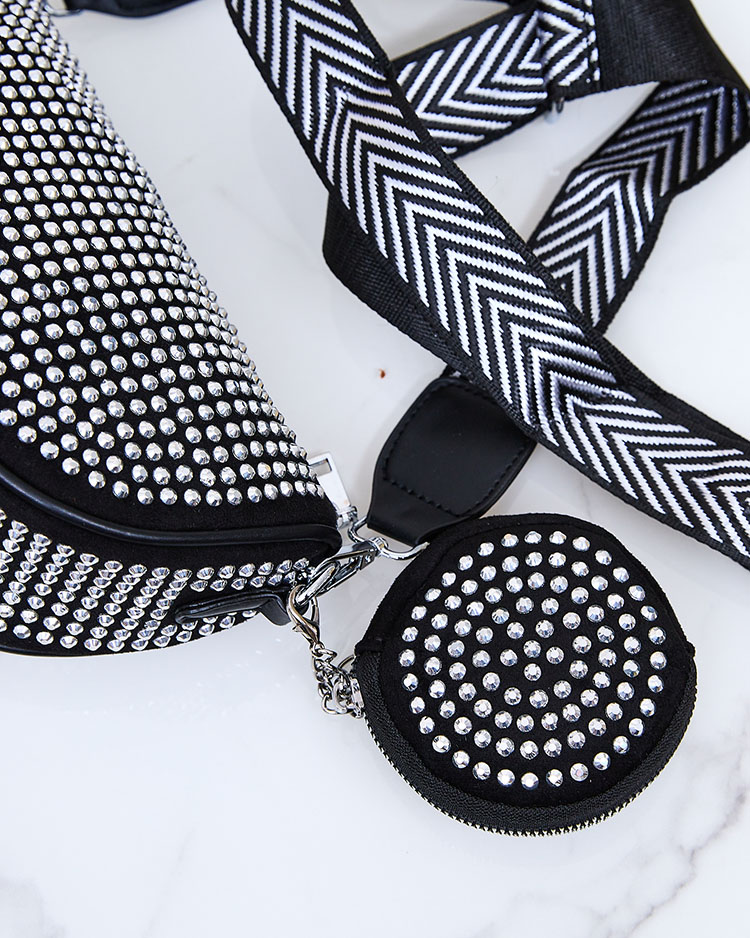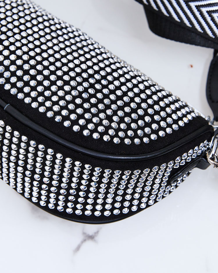 - Невелика жіноча сумочка з екологічної замшевої шкіри з декоративними блискучими стразами. Сумочка має 1 відділення та 1 внутрішню кишеню. Крім того, знімний, регульований ремінець та мішечок. Модель застібається на блискавку.