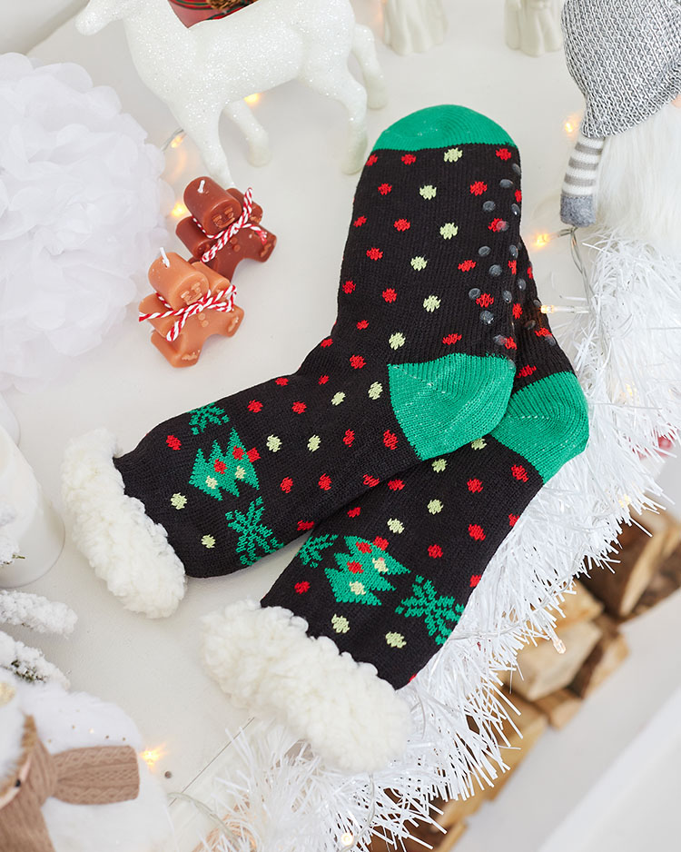 - Красиві жіночі щільні шкарпетки з різдвяним візерунком з неслизьким низом. Усередині утеплені білою теплою овчиною. Шкарпетки чудово підійдуть для холодних вечорів.