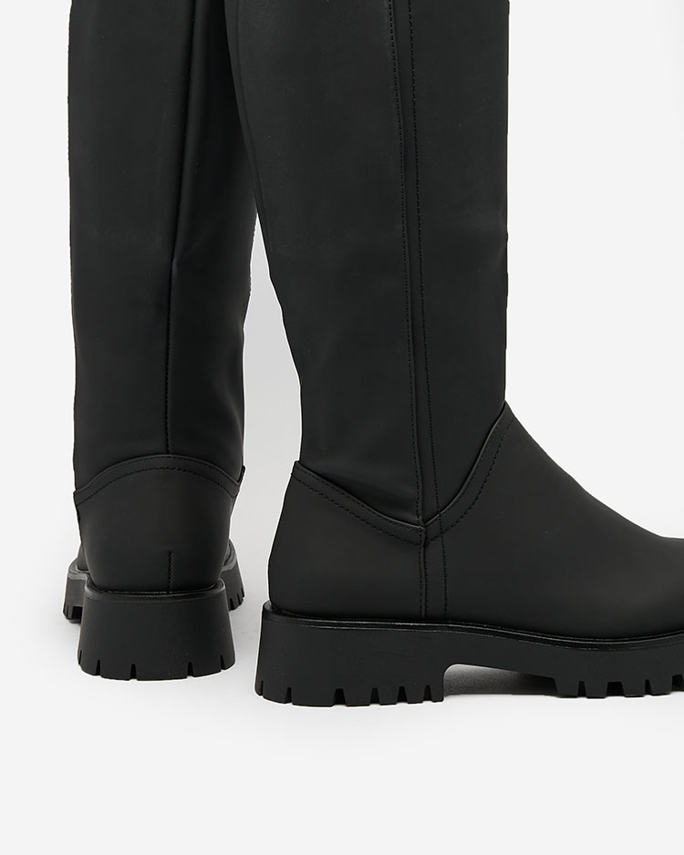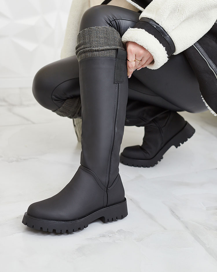 • Жіночі чоботи до коліна, виготовлені з матової екошкіри. Модель на плоскому каблуці та з м'якою хутряною підкладкою. Взуття на шнурівці та застібається на блискавку до середини гомілки.