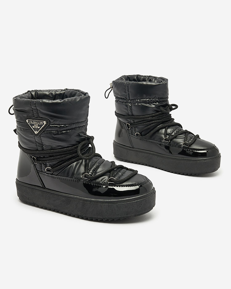 - Жіночі снігоступи поза часом. Верх виконаний з матеріалу a'la cerata та вставками з лакованої екошкіри. Усередині утеплення у вигляді хутра, взуття на шнурівці. Ідеальний варіант для холодної пори року!