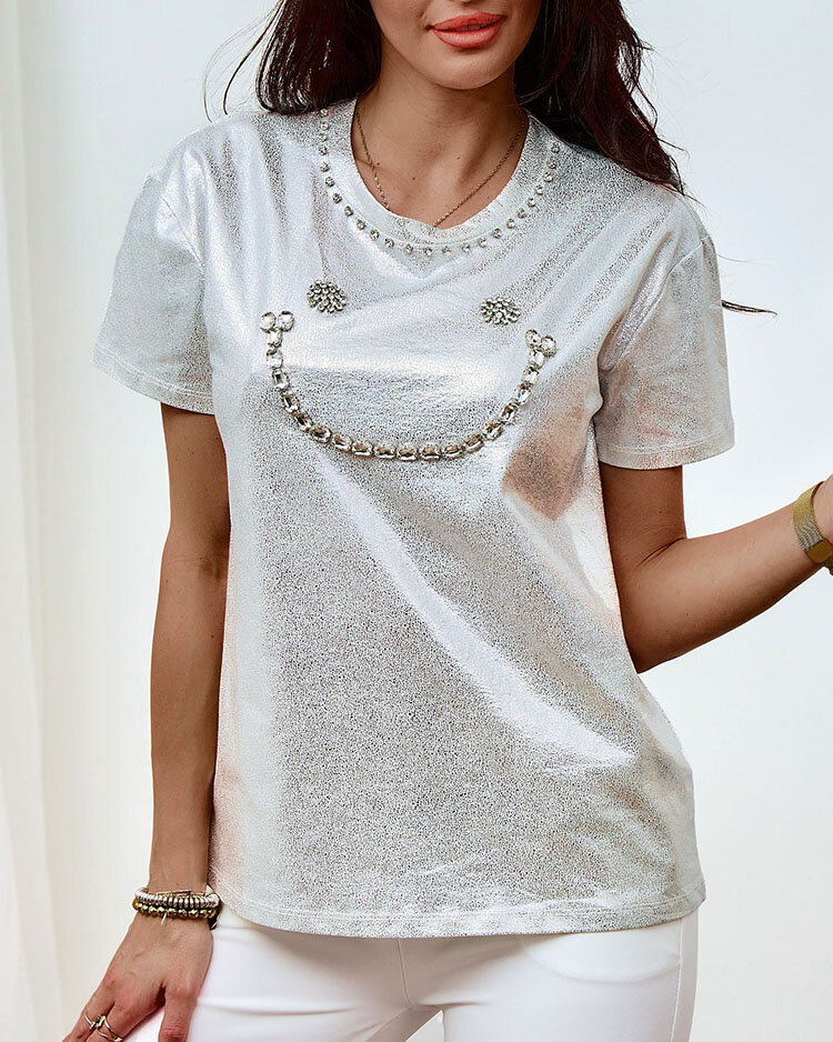 • Блискуча жіноча футболка з коротким рукавом. Виконана з бавовняної тканини. Модель прикрашена цирконами. Ідеальна основа для багатьох повсякденних образів! ПРИМІТКА: Похибка вимірювання (+/-) 1 см. Розміри виміряні в горизонтальному положенні.