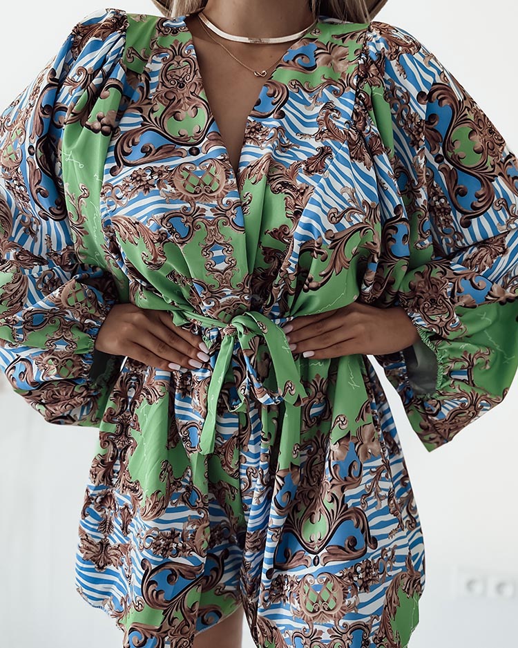 - Жіночий комбінезон ідеально підходить для літа! Він прикрашений яскравим принтом. Довгі, широкі рукави та короткі штанини додають легкості, а пояс підкреслює талію. Створений для жінок, які люблять моду та стиль!