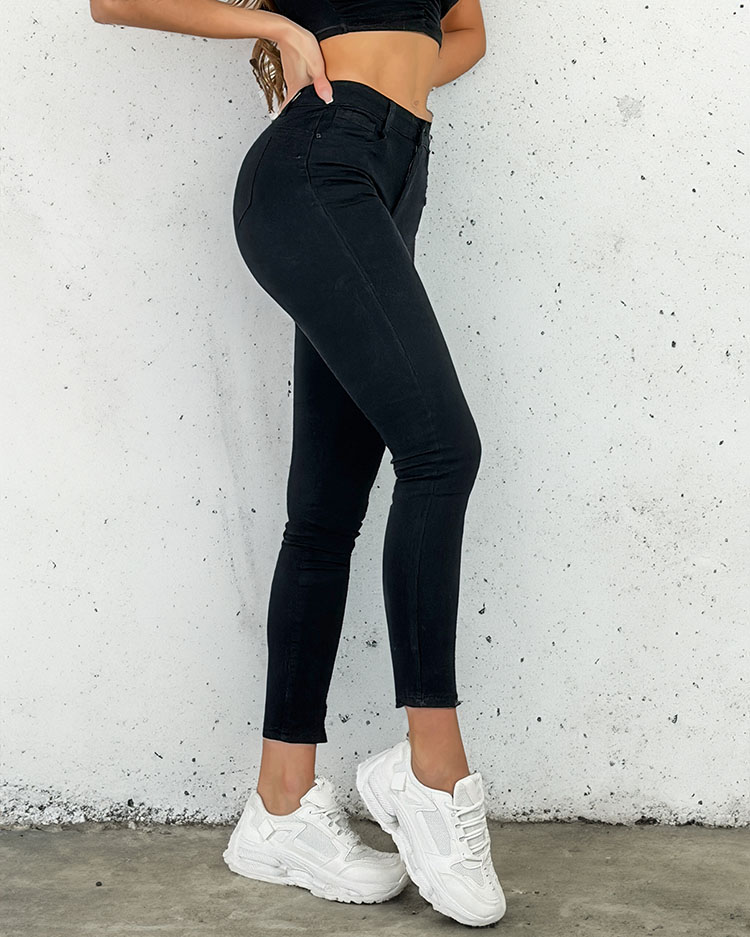 - Жіночі джинси-дудочки з бавовняної тканини. Модель із середньою талією, застібка на ґудзики та блискавку. Дві пари кишень - ззаду і спереду.