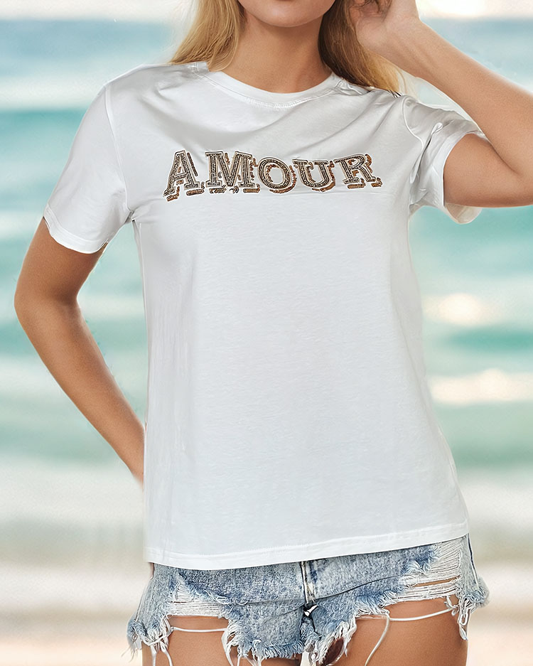 - Унікальна жіноча футболка з коротким рукавом та круглим вирізом. Передня частина футболки прикрашена принтом з блискучими паєтками та цирконами. ПРИМІТКА: Похибка вимірювання (+/-) 1 см.