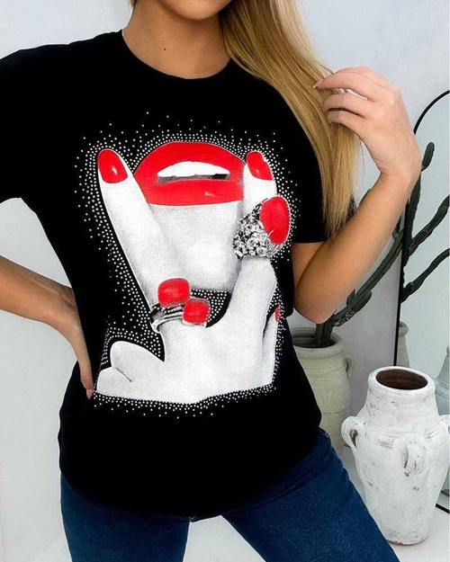• Повсякденна жіноча футболка з принтом та цирконами на короткий рукав. Виготовлена з бавовняної тканини. Ідеальна основа для багатьох повсякденних образів! ПРИМІТКА: Похибка вимірювання (+/-) 1 см. Розміри виміряні в горизонтальному положенні.