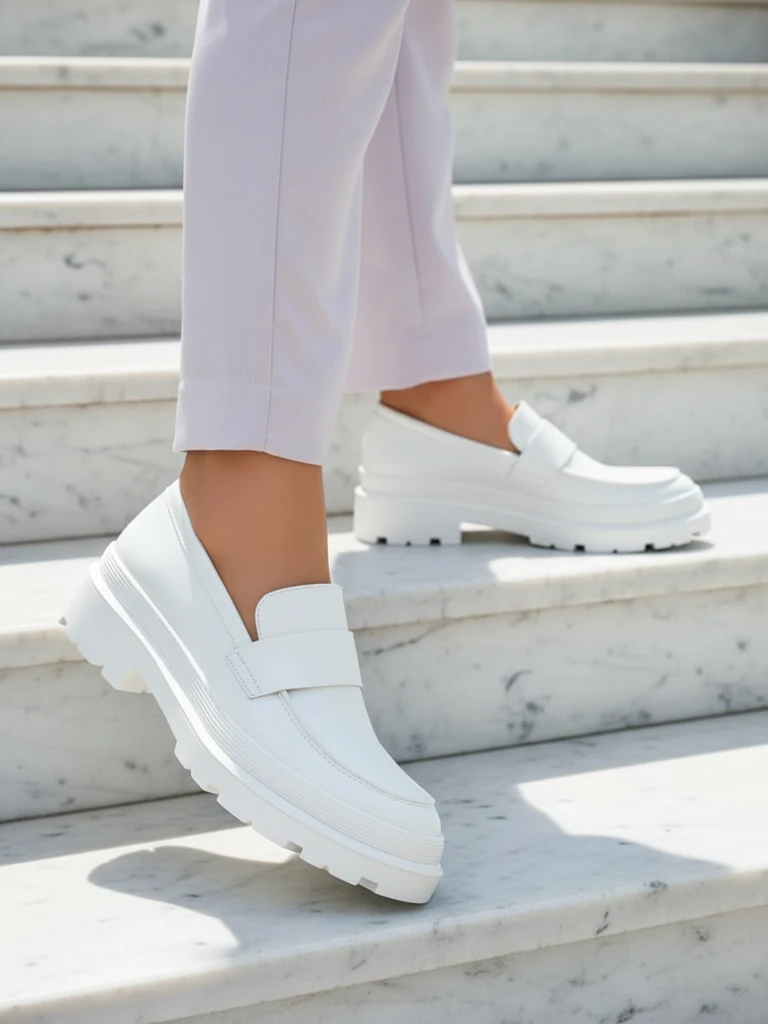 Мокасини на платформі – один з найгарячіших трендів останніх сезонів. Вони поєднують в собі класичну елегантність з сучасним, дещо андрогінним стилем. Біле взуття є хітом весни та літа, додаючи свіжості та легкості кожній стилізації. Модель Aura чудово вписується в напрям моди «comfort-first», де зручність йде в парі з вишуканим дизайном. Це ідеальний вибір для жінок, які хочуть слідувати за тенденціями, не відмовляючись від практичності.