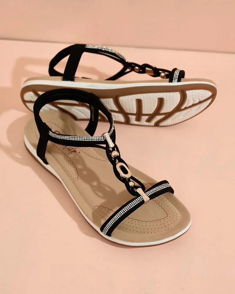 • Жіночі босоніжки на плоскій підошві - ідеальна ідея для спекотних літніх днів. Модель повністю виконана з матової екологічної шкіри. Верх оздоблений декоративними стразами.