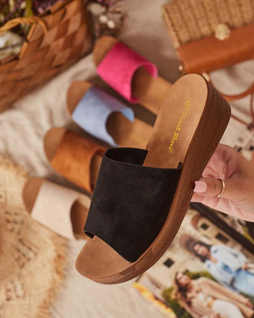 - Жіночі шльопанці із замшевої екошкіри та устілкою з екошкіри. Невисокий каблук та платформа додають шарму та характеру. Насолоджуйтесь комфортом та стилем, беручи це взуття на відпочинок!
