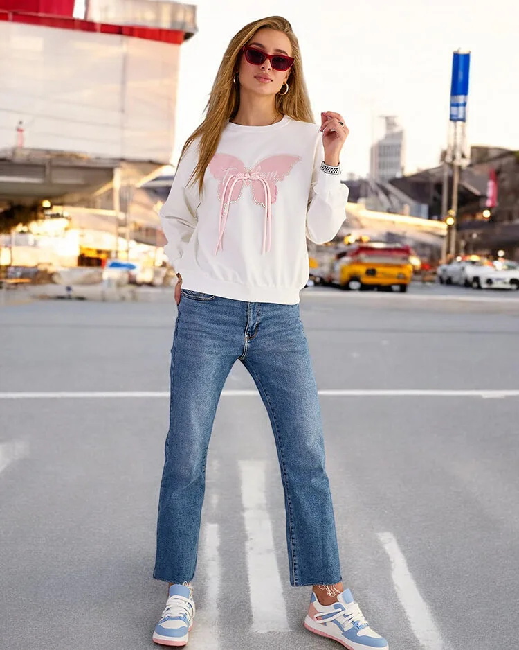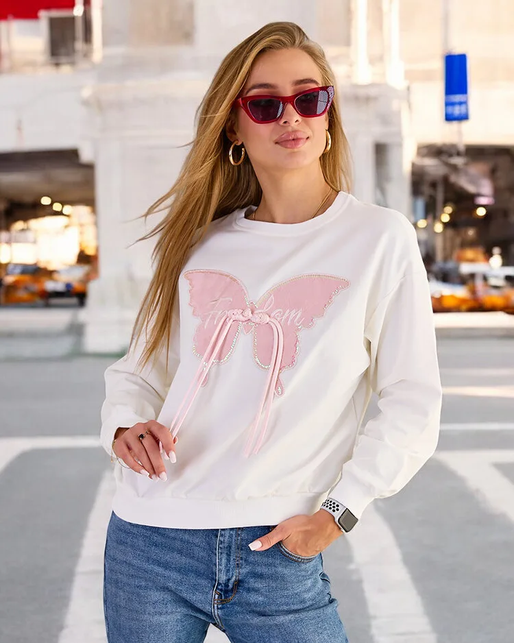 • Додайте стилю своєму вбранню з нашим тонким світшотом, прикрашеним нашивкою з метеликом. Вставляється через голову, з круглим вирізом і довгими рукавами. Ідеально підходить на кожен день, коли ви хочете почуватися невимушено, але стильно!