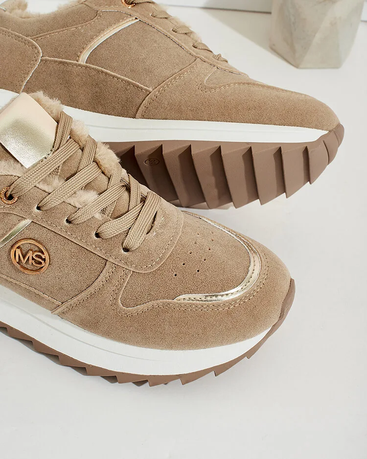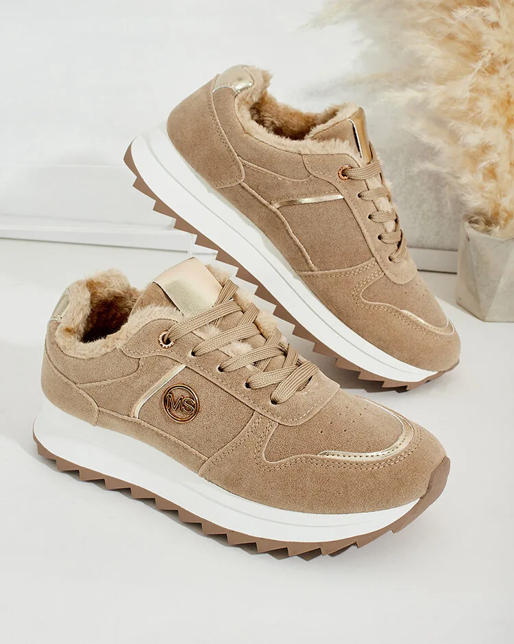• Спортивні жіночі кросівки на потовщеній підошві. Верх на шнурівці, з екологічно чистого нубуку. Внутрішня частина повністю утеплена хутром. Ідеальні для холодних днів!