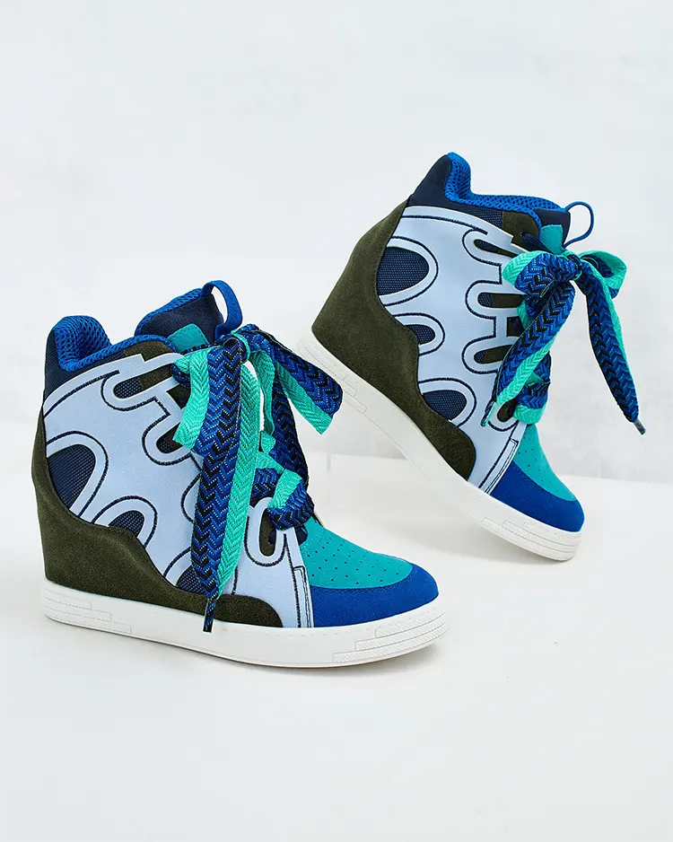 • Спортивні жіночі черевики на підборах, виготовлені з комбінації еко-шкіри та еко-замші. Взуття зав'язане декоративними шнурками, всередині устілка з екошкіри.
