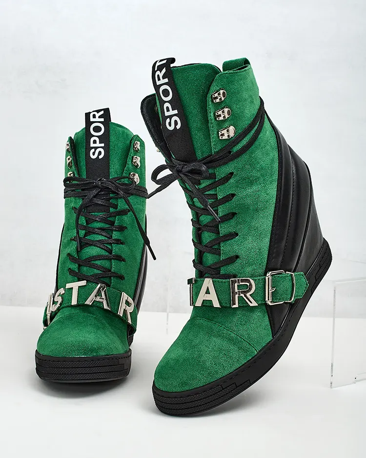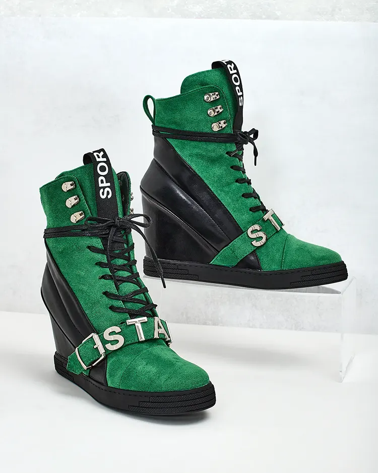 • Спортивні жіночі черевики на підборах, виготовлені з комбінації еко-шкіри та еко-замші. Черевики на зав'язках з декоративним оздобленням зверху, всередині тканинна устілка.