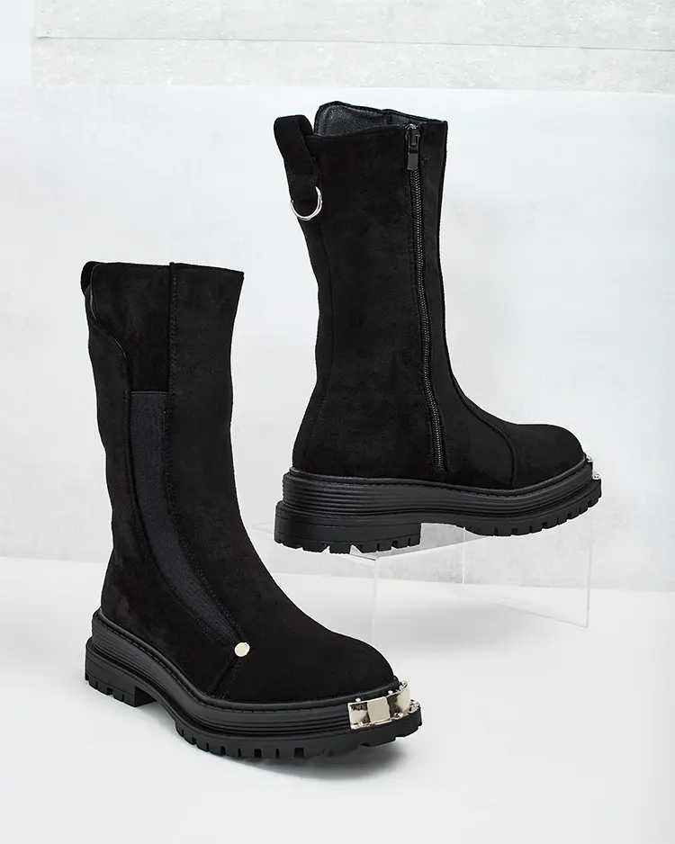 - Жіночі високі чоботи на плоскій підошві, виготовлені зі шкіри екозамші. Всередині підкладка з м'якого хутра, модель на блискавці. Ідеальний варіант для осені!