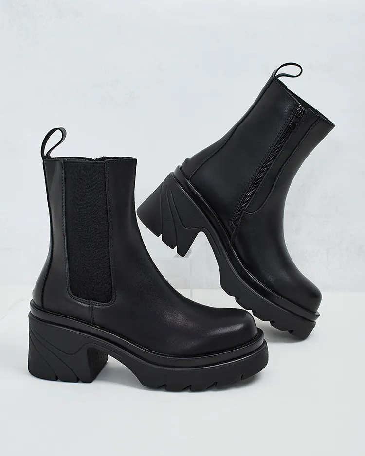 - Високі жіночі черевики на товстій платформі. Взуття повністю виготовлене з екологічної шкіри. Застібаються на блискавку. Ідеальний вибір на осінь!
