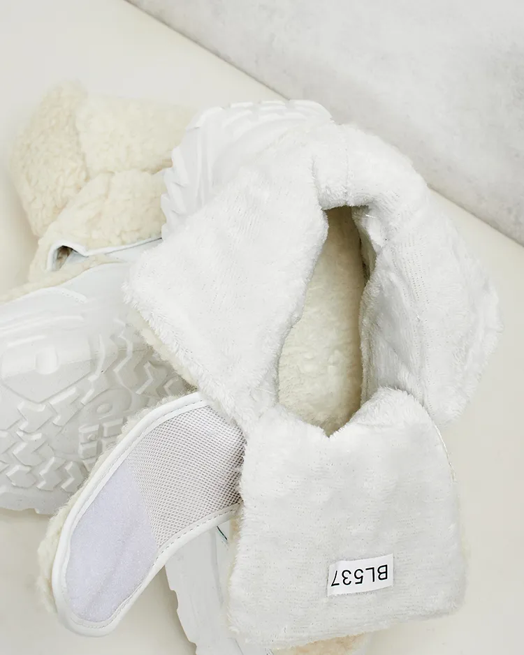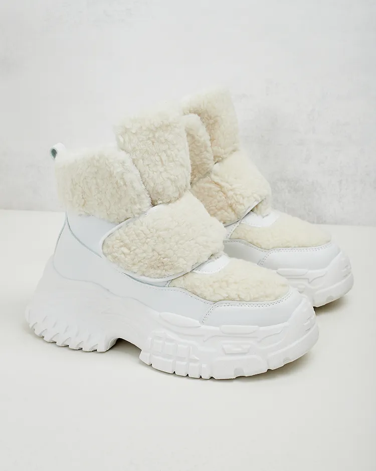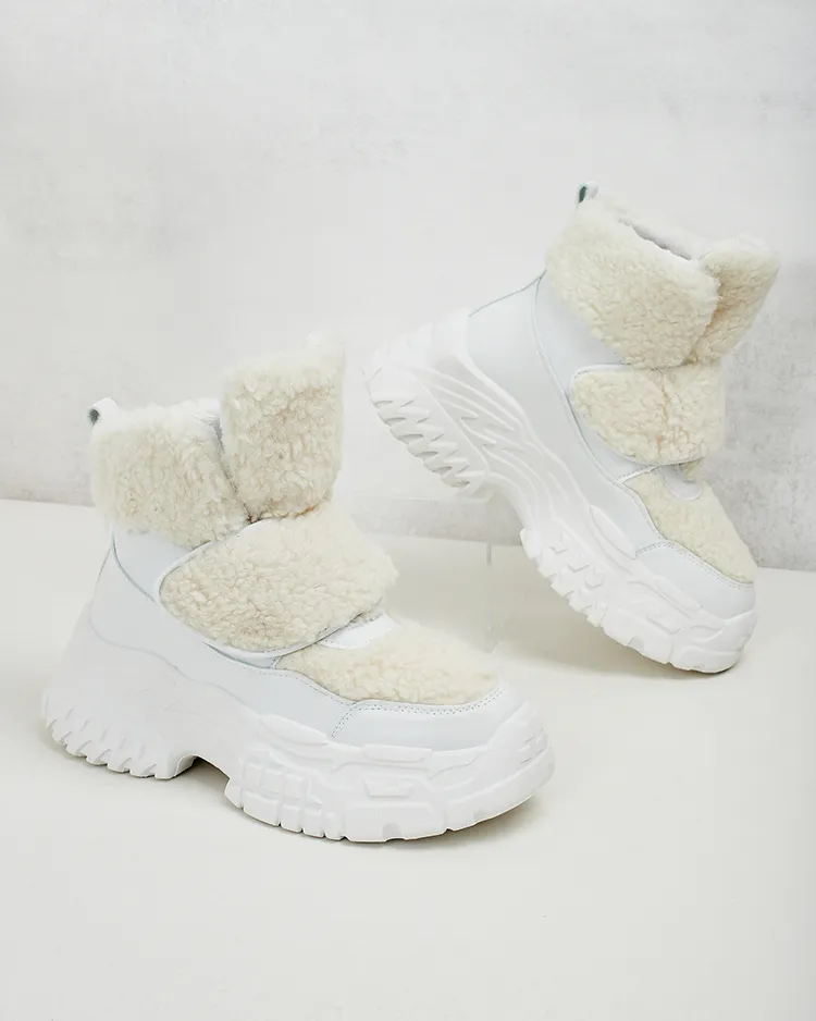 - Жіночі снігоступи поза часом. Верх виконаний з екологічної шкіри зі вставками під овчину. Утеплювач у вигляді хутра всередині, черевики мають застібку на липучці. Ідеальний варіант для холодної пори року!