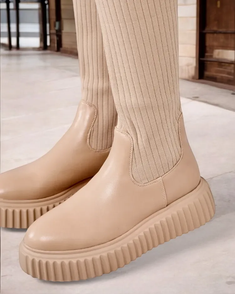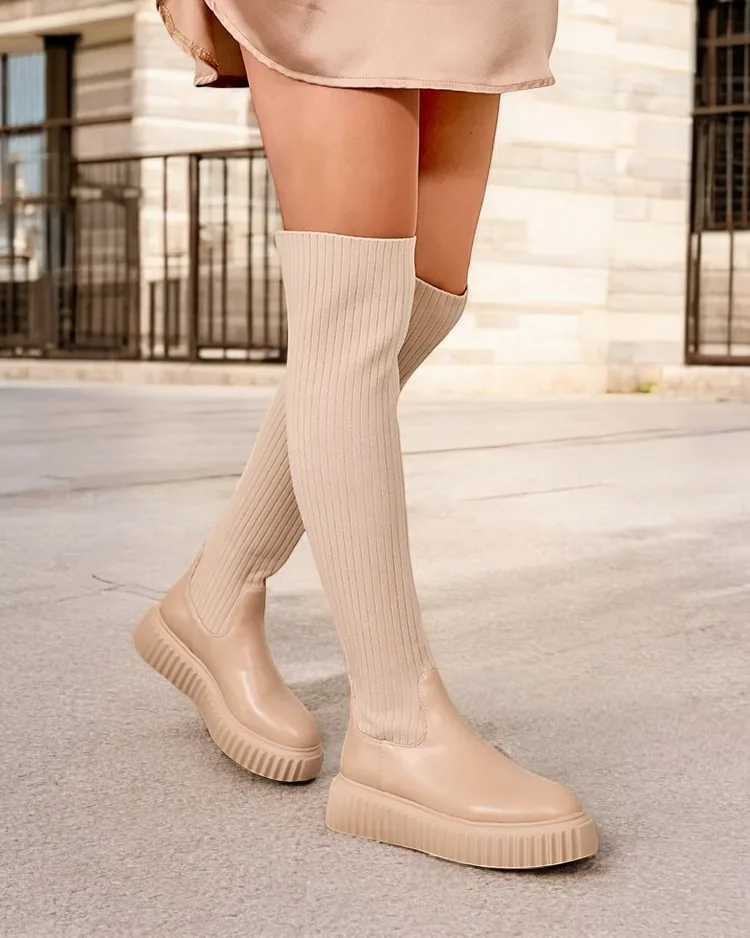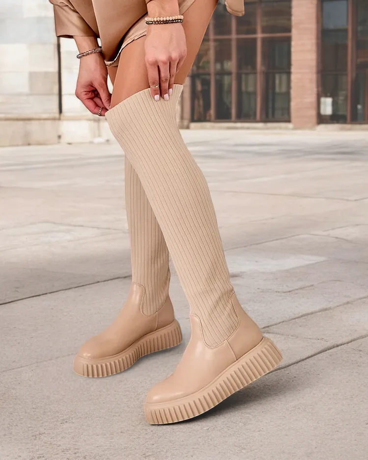 - Стильні жіночі черевики вище коліна на потовщеній підошві. Верх виконаний з еластичного ребристого тканинного матеріалу та має вставки з еко-шкіри. Устілка з натурального хутра. Модель сліпони.