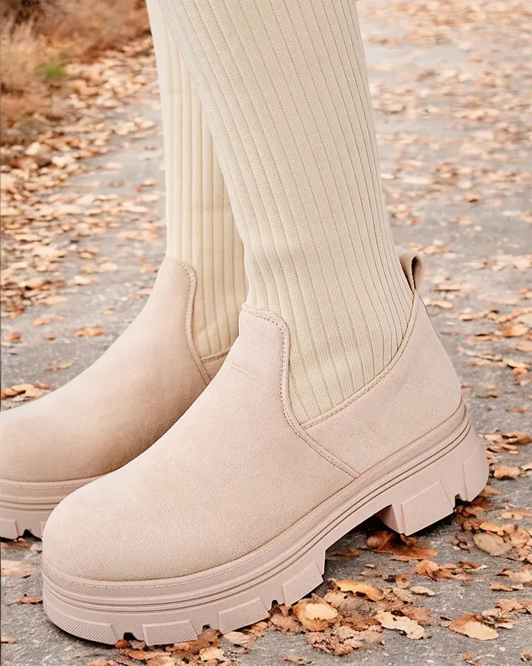 • Стильні жіночі чоботи до коліна на пласкому каблуці. Верх виконаний з еластичного тканинного матеріалу в поєднанні з еко-замшею, всередині хутряна устілка. Модель на шнурівці. Ідеальний варіант для повсякденних осінніх образів!