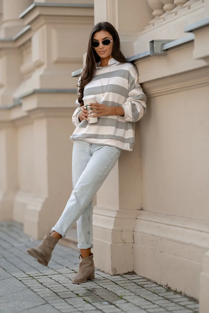 - Жіночий светр з круглим вирізом горловини з приємної тканини в смужку. Модель має довгий рукав. Ідеальна основа для зимових образів!
