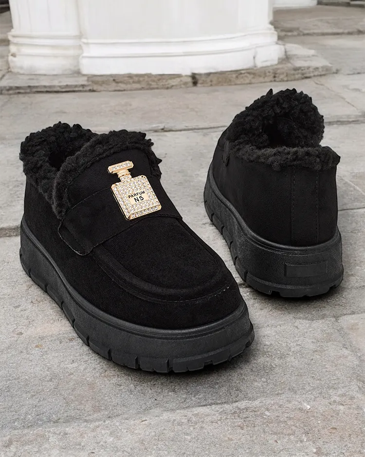 - Утеплені жіночі мокасини на платформі. Класична модель виготовлена із замшевої екологічної шкіри та наповнювача a' la кожушок. Підошва у формі платформи. На халяві незнімна прикраса з цирконіями.